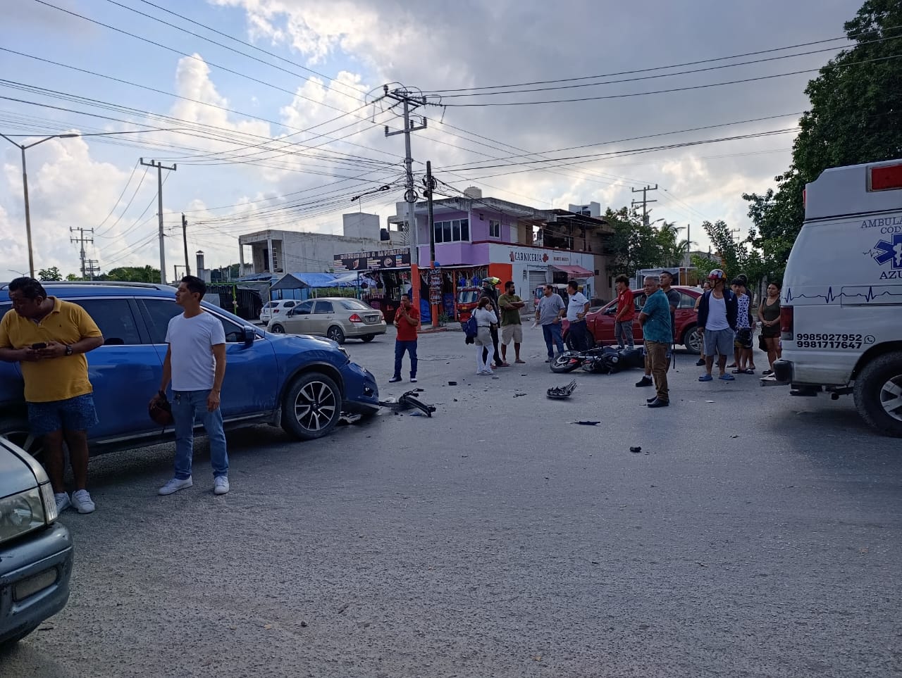 Cancún.- Un motociclista resultó gravemente lesionado luego de ser impactado por un vehículo particular color azul en la avenida Los Tules, a la altura de la Región 247 en Cancún.
