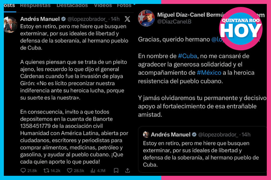 Tras el mensaje del ex mandatario mexicano, el presidente de Cuba, Miguel Díaz-Canel, agradeció públicamente el gesto de solidaridad, también mediante sus redes sociales, destacando el respaldo mostrado hacia el pueblo cubano.