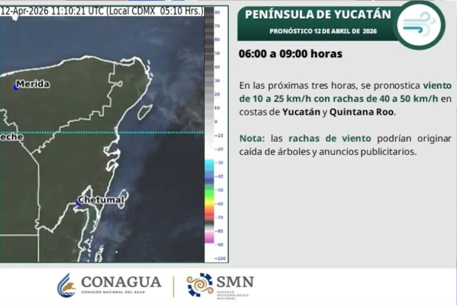 El Servicio Meteorológico Nacional advierte sobre rachas de viento de hasta 50 km/h en Quintana Roo durante la mañana, con riesgo de caída de árboles y afectaciones en zonas costeras.