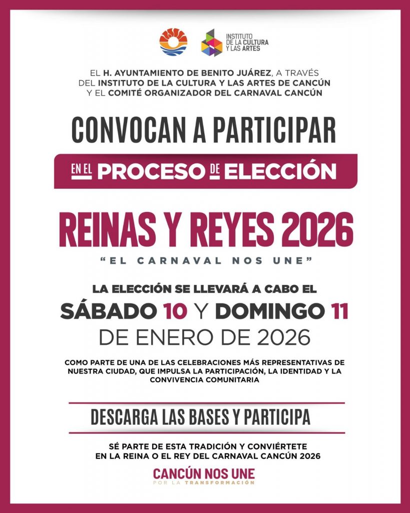 Cancún.- Con el objetivo de fortalecer una de las tradiciones más representativas de la ciudad, el Instituto de la Cultura y las Artes de Benito Juárez, abrió oficialmente la convocatoria para la selección de las Reinas y Reyes del Carnaval Cancún 2026, un proceso que promueve la cultura, la inclusión, la diversidad y la convivencia en un espacio seguro y libre de violencia.
