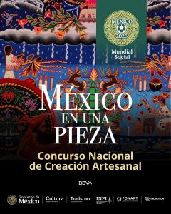 “México en una pieza” es convocado por la Secretaría de Cultura, a través de Fonart, Artesanías Mexicanas y el Instituto Nacional del Derecho de Autor, en colaboración con la Secretaría de Turismo de México, BBVA y Fomento Cultural BBVA México, con el apoyo del Instituto Nacional de los Pueblos Indígenas, sumándose a las actividades culturales rumbo al Mundial Social 2026.