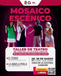El próximo 28 de marzo a las 14:00 horas, en la Casa de la Cultura de Cancún, alumnos del taller de teatro dirigidos por la maestra Lic. Alicia Villavicencio presentarán las piezas “El censo” de Emilio Carballido y “La abuela Perla” de Denis Vento, en una función abierta al público que celebra el teatro como expresión viva.