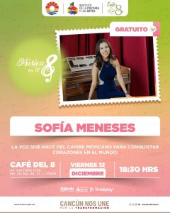 Cancún.- Una voz que ha crecido y va consolidando una gran trayectoria en Cancún es la de Sofi Meneses, joven talento que es muy querida por la comunidad y que va compartiendo su música en distintos escenarios, llega hoy al Café del 8 en los viernes de música.