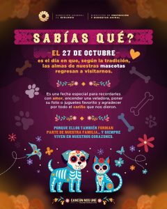 Cancún.- Como parte de las tradiciones que enaltecen nuestras raíces, el próximo 27 de octubre se conmemorará el regreso de las almas de las mascotas al mundo terrenal, una fecha especial en la que se honra a esos fieles compañeros que dejaron una huella imborrable en nuestras vidas.
