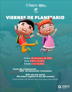 La jornada “Viernes de Planetario” se realizará el viernes 30 de enero, de 8:30 a 13:30 horas, dirigida a niñas y niños de 6 a 12 años