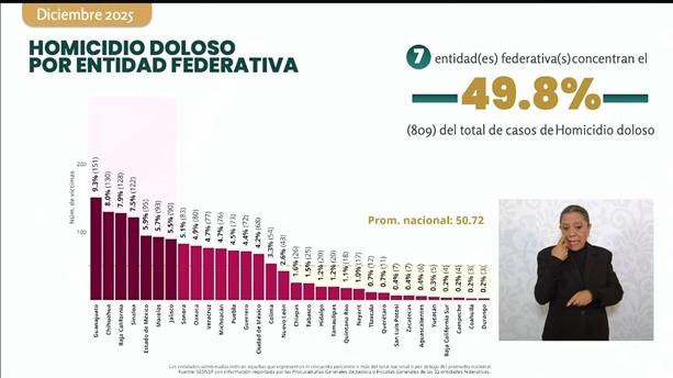 Marcela Figueroa Franco, secretaria ejecutiva del SNSP, informó que siete entidades concentraron el 50.5% de los homicidios en 2025; sin embargo, 26 estados redujeron este delito, con caídas destacadas en Zacatecas (-71.1%), Chiapas (-58%) y Quintana Roo (-56.8%). Guanajuato, Baja California y Estado de México registraron reducciones sostenidas y mínimos recientes.