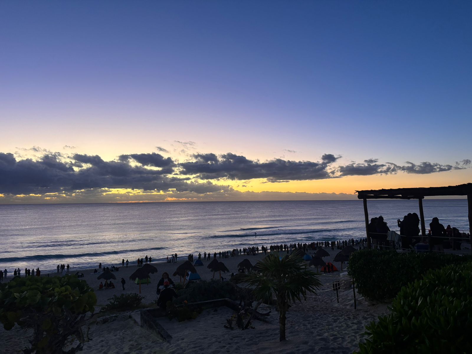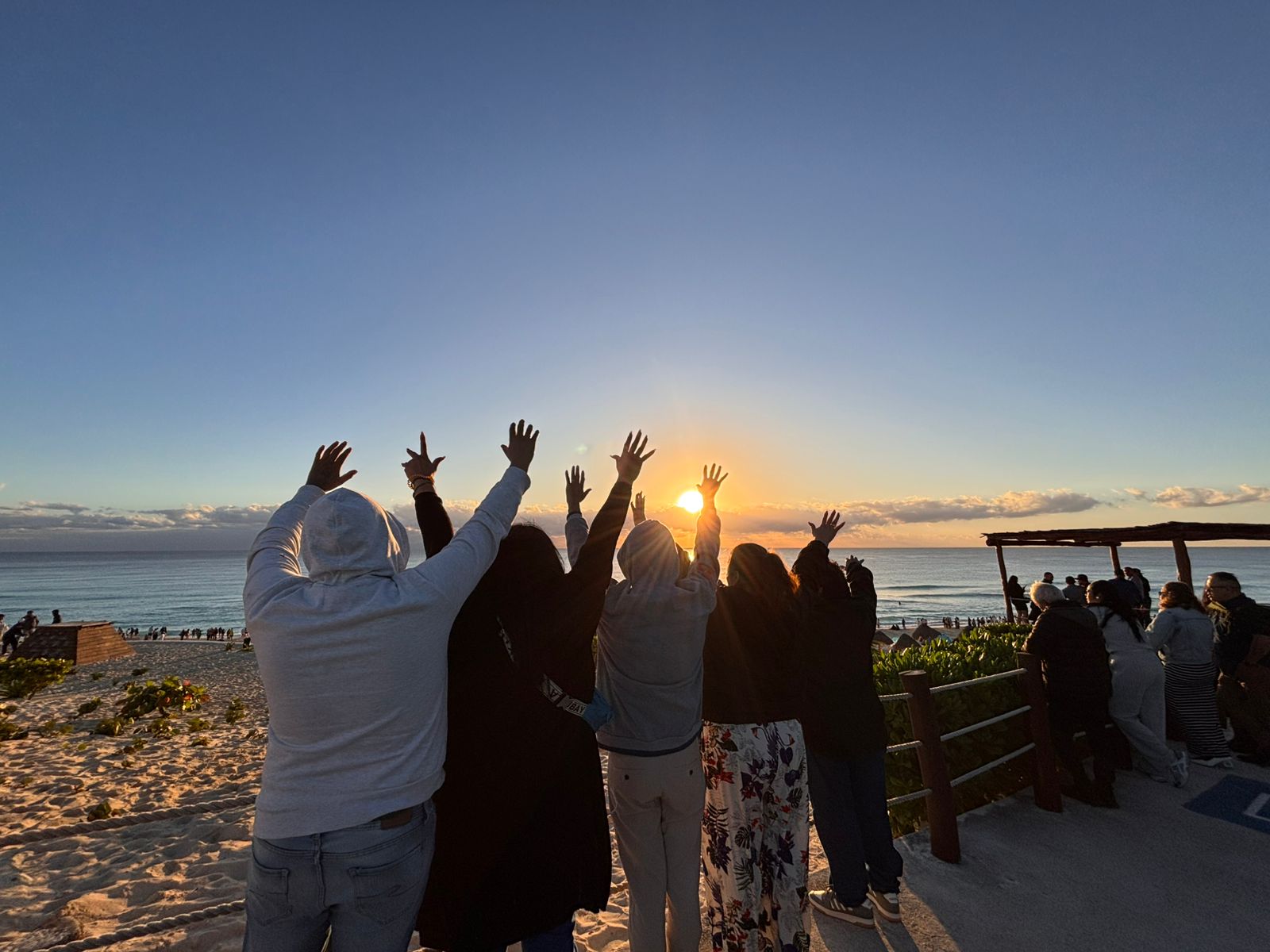 El sol emergió alrededor de las 7:24 horas tiñendo el cielo de tonos anaranjados, mientras las olas rompían suavemente en la arena, generando aplausos, abrazos y lágrimas de emoción entre los asistentes que celebraron este momento como una tradición arraigada en Cancún.