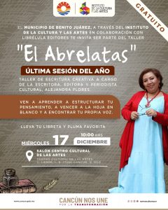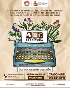 Este miércoles 17 de diciembre se llevarán a cabo las últimas sesiones del año de los Talleres Gratuitos de Escritura de la maestra Alejandra Flores, dos espacios abiertos al público que despiden el ciclo con la promesa de regresar renovados el próximo año.
