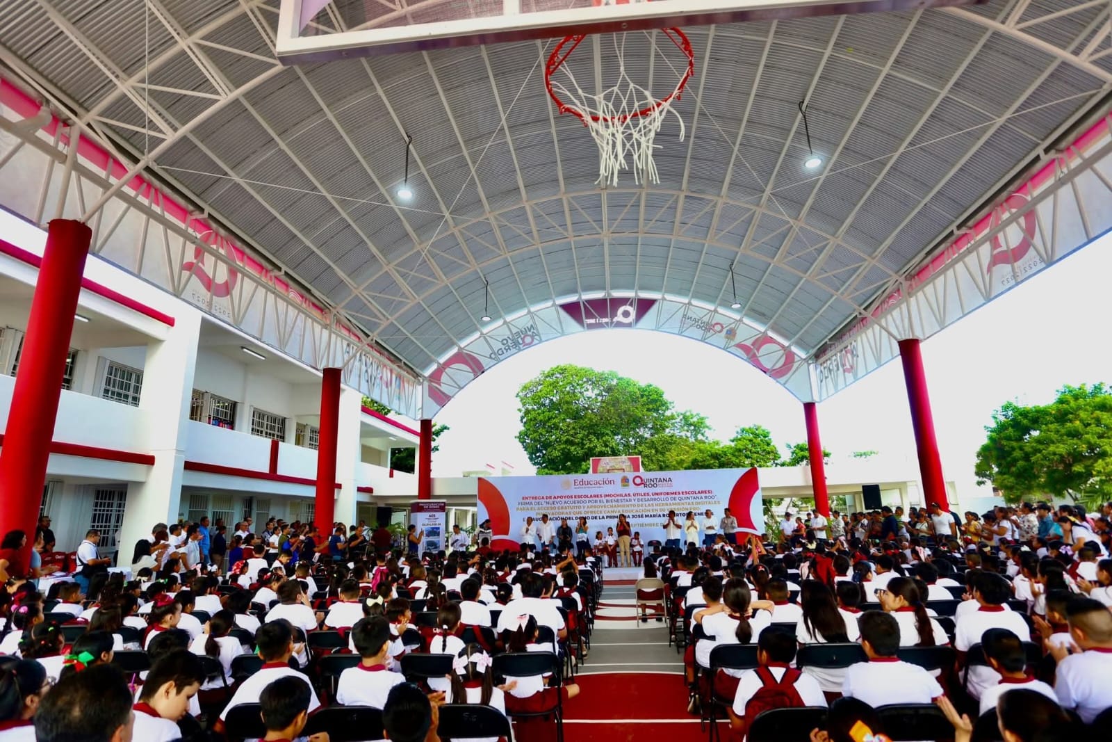 El funcionario estatal recordó que la meta es construir más de mil 100 domos para proteger a los estudiantes del sol y la lluvia, permitiendo actividades deportivas y culturales en espacios seguros y dignos.