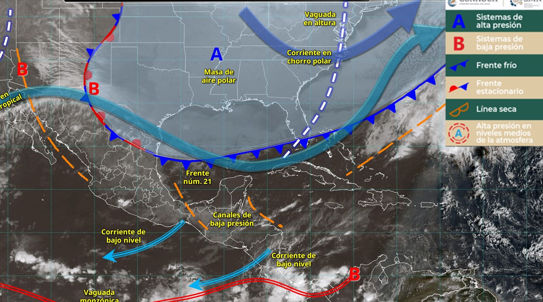 El frente número 21 se extenderá con características de estacionario sobre el centro del Golfo de México hasta el noreste y oriente del país