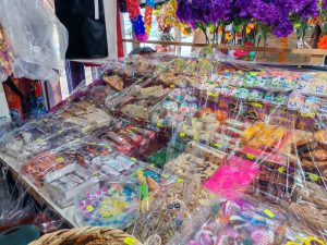 Los dulces en el caso de las calaveritas, las pequeñas están en 13 pesos la pieza, e incluso hay dulces de 20,25, 30 y hasta 50 pesos la pieza; en el caso del dulce de yuca, camote o calabaza esta en 50 o 65 pesos la bolsita.