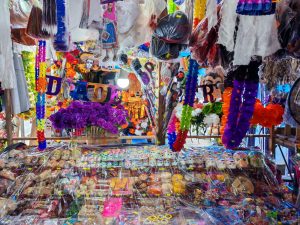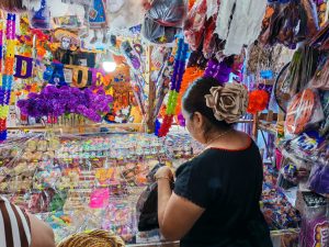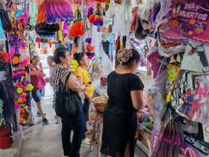 Como ejemplo el mercado Lázaro Cárdenas en Chetumal, mejor conocido como Mercado Nuevo, ya se pueden ver las tradicionales velas de colores y una infinidad de artículos para adornar los altares como papel picado, banderitas, calaveras y dulces de diferentes tamaños y precios.