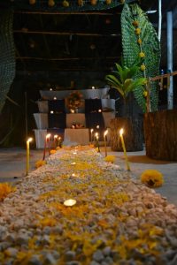 El papel picado representa el viento y la fragilidad de la vida, y la flor de cempasúchil, con su aroma y color intenso, marca el sendero hacia el altar.