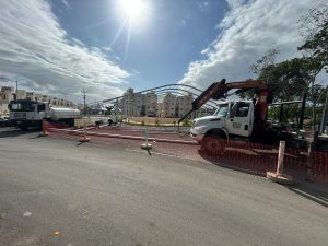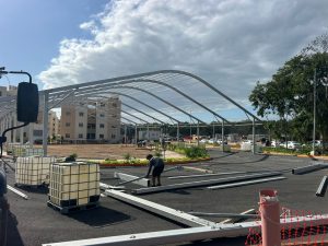 Playa del Carmen.- Con personal y grúas, avanza la construcción del escenario para la visita mañana de la presidenta Claudia Sheinbaum Pardo, para la entrega de las “Viviendas del Bienestar”, detrás del fraccionamiento Villas del Sol.