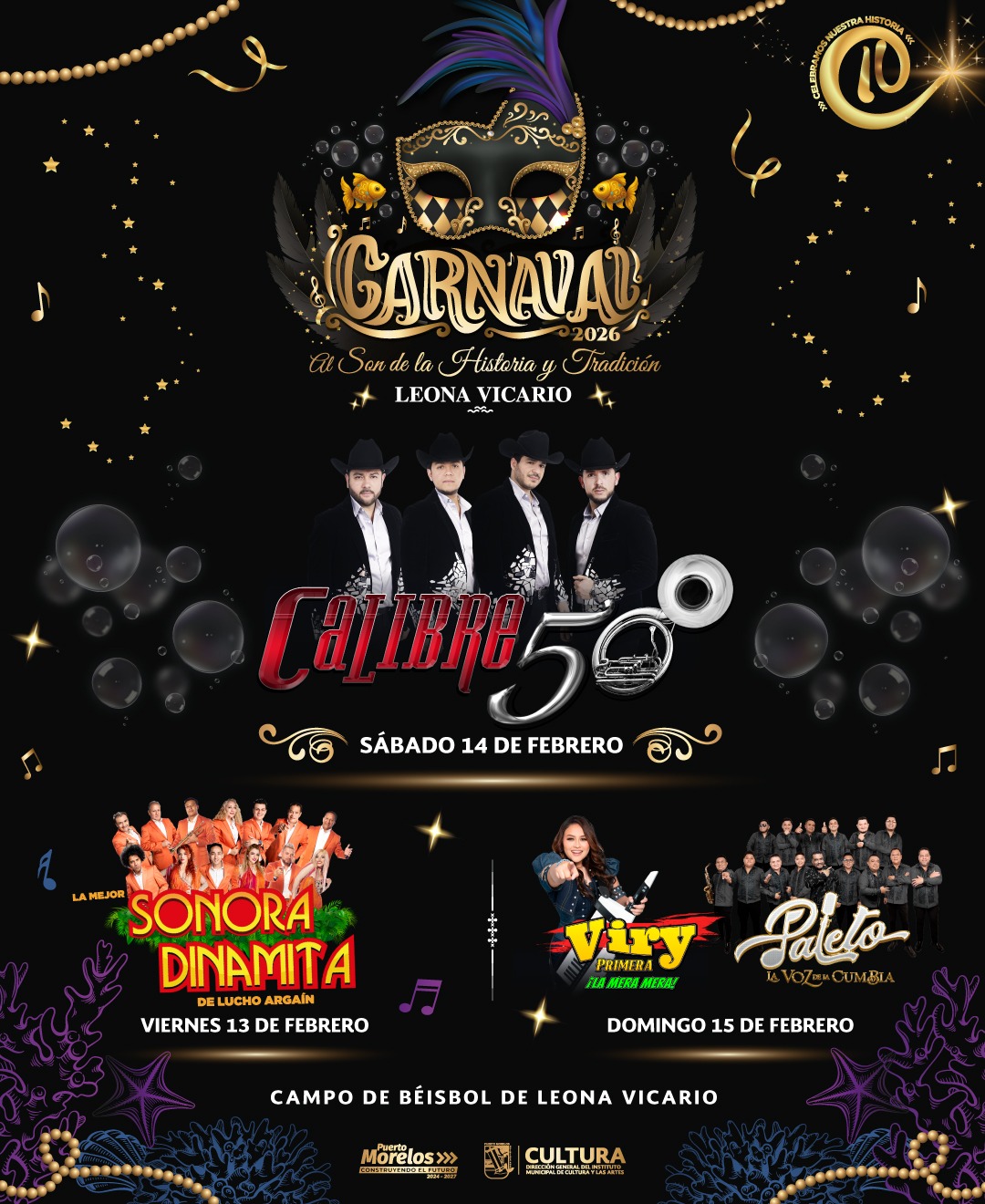 *En el marco del 10 Aniversario del municipio las fiestas carnestolendas se engalanarán con artistas como “Los Ángeles Azules”, “Calibre 50”, “Sonora Dinamita” y “La Arrolladora Banda Limón”, entre otros. Se espera rebasar los 13 mil asistentes de 2025 en Puerto Morelos y 11 mil en Leona Vicario