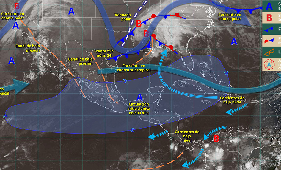 A nivel nacional, el frente frío número 34 y una vaguada polar se desplazan sobre el norte del Golfo de México y dejan de afectar al país. No obstante, la masa de aire frío asociada aún provoca efectos importantes en varias regiones.