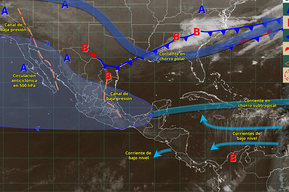 A nivel nacional, una circulación anticiclónica, combinada con la entrada de humedad del océano Pacífico y el golfo de México, favorecerá tiempo estable y ambiente de caluroso a muy caluroso en gran parte del país. La onda de calor persiste con fuerza en entidades del norte, occidente y sur del territorio mexicano.