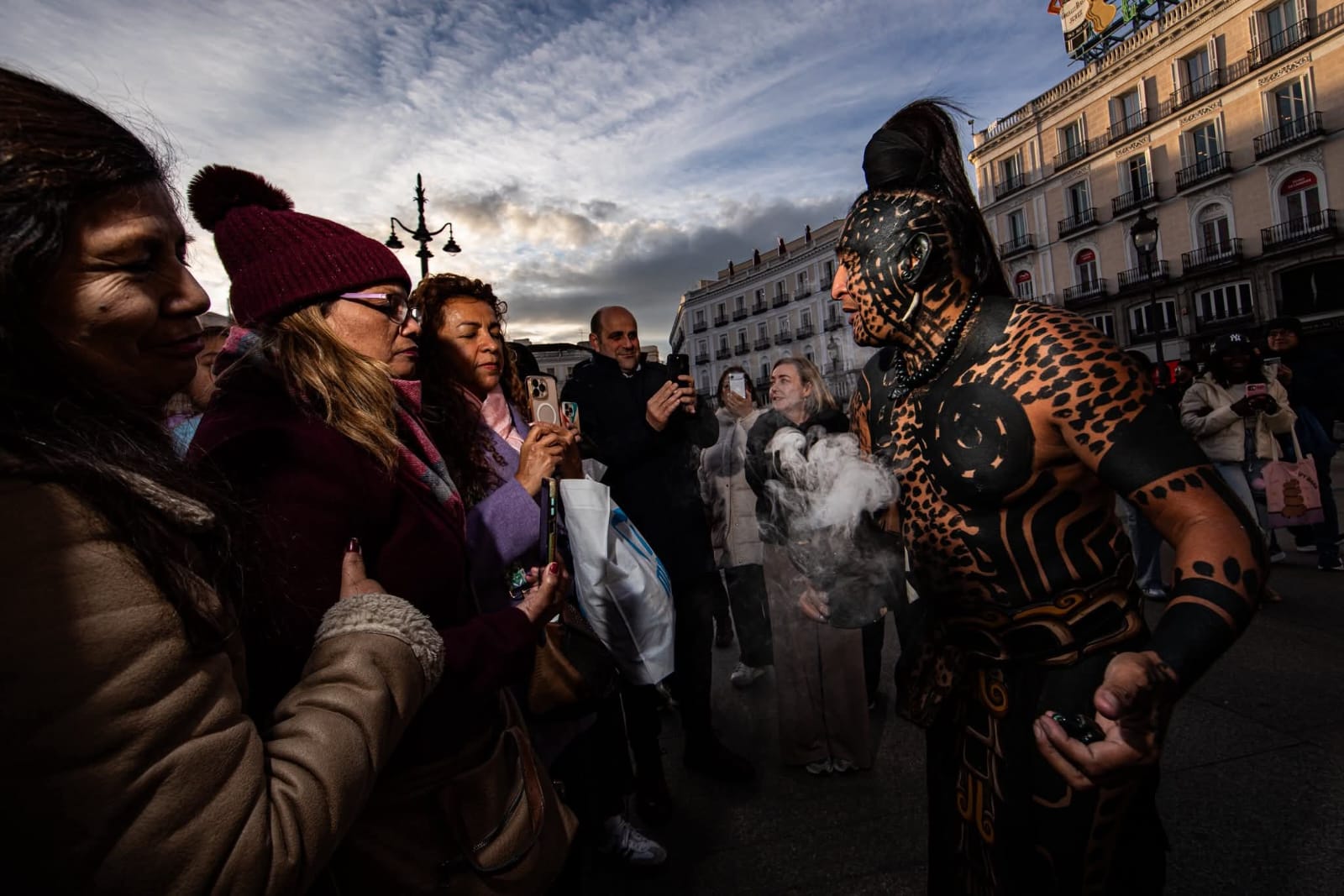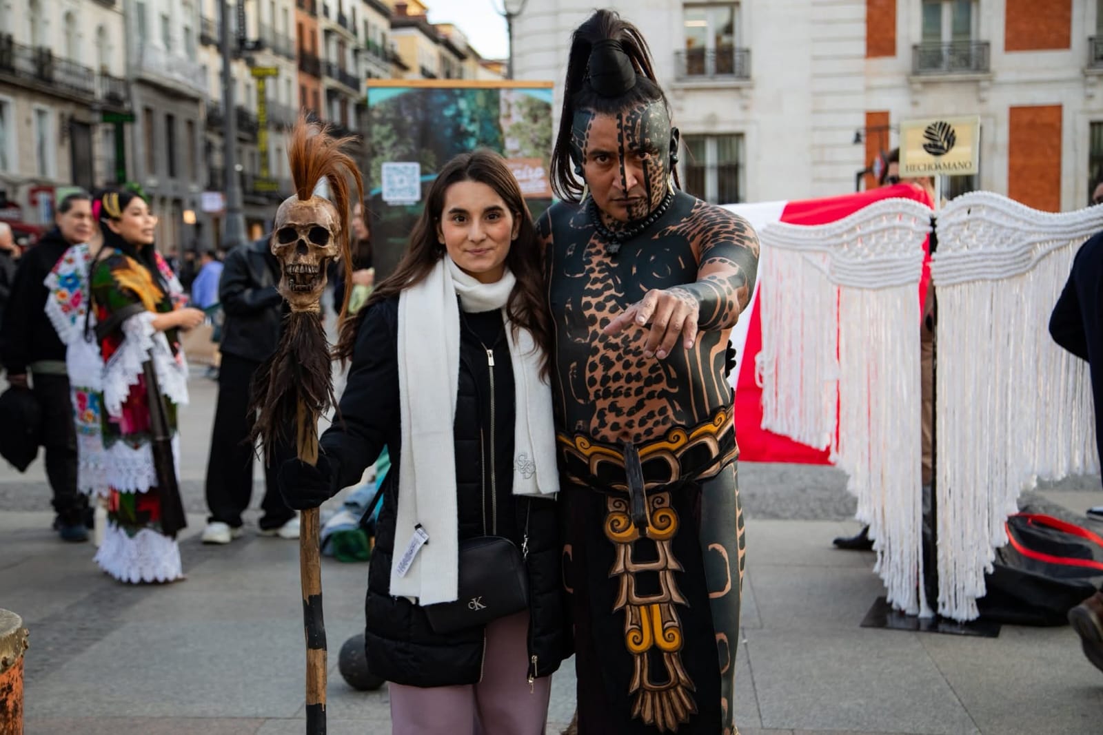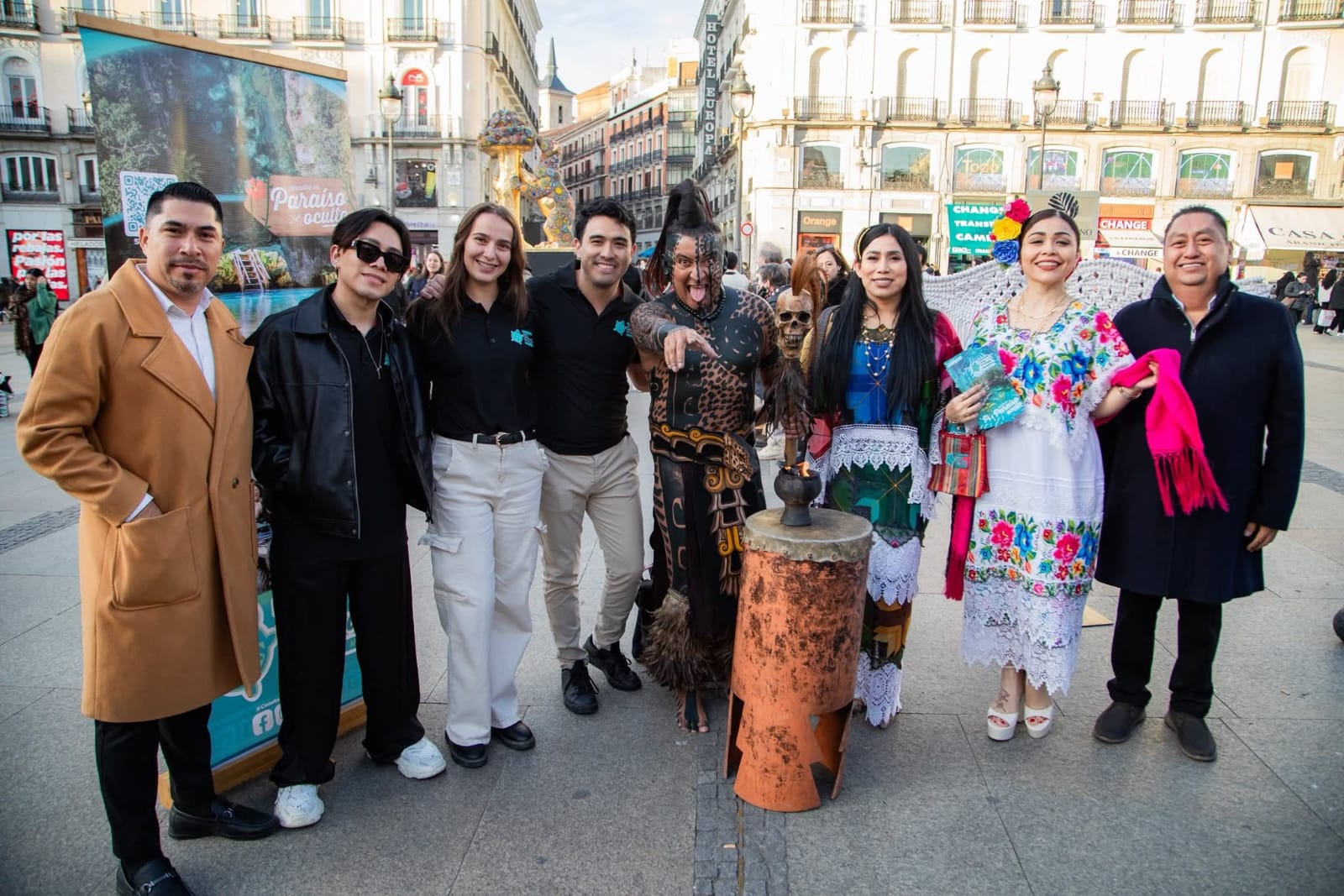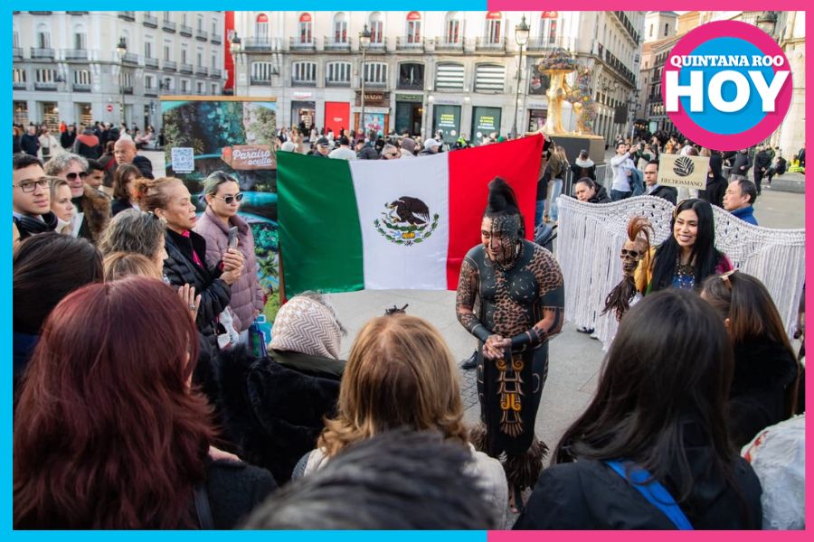 Tulum.- Con una representación simbólica de la cultura maya, el personaje conocido como “El Último Maya”, originario de Tulum, realizó una presentación pública en la Puerta del Sol, uno de los puntos más emblemáticos de la capital española, como parte de una acción de promoción cultural y turística del Caribe Mexicano.
