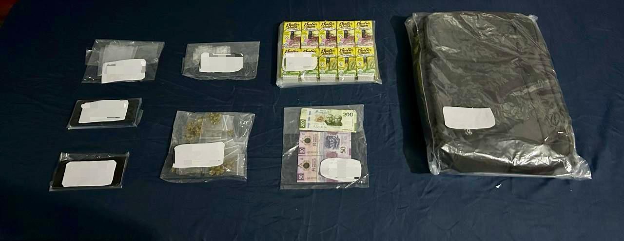 A Jorge Luis “N” se le aseguraron una bolsa mediana de plástico transparente; 18 bolsitas con vegetal verde y seco con características similares a la marihuana; 14 bolsitas con fragmentos cristalinos parecidos al cristal; 300 pesos mexicanos en billetes de distintas denominaciones; una mochila; 10 cajas de cigarros electrónicos tipo vape que contenían líquido con características similares a la marihuana; dos teléfonos celulares, y un vehículo marca Volkswagen, tipo Jetta, modelo 2004, color gris, con placas de circulación del Estado de México.