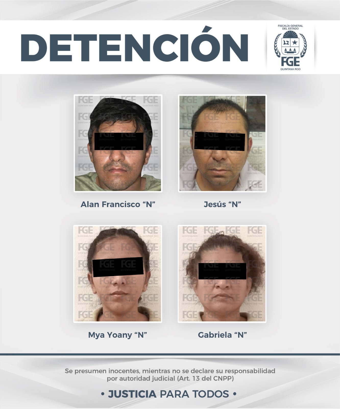 Chetumal.- La Fiscalía General del Estado de Quintana Roo informa el cumplimento, por separado, de cuatro órdenes de aprehensión en contra de dos masculinos y dos mujeres, por su probable participación en hechos posiblemente constitutivos del delito de homicidio calificado, en agravio de un masculino de identidad reservada, ocurrido el 20 de diciembre de 2025 en Chetumal.