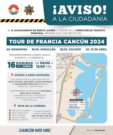 La dirección de Tránsito Municipal realizará diferentes cierres viales desde las 4:00 a las 12:00 horas, en la Avenida Bonampak, Boulevard Kukulcán, Boulevard Luis Donaldo Colosio y Avenida 16 de abril.