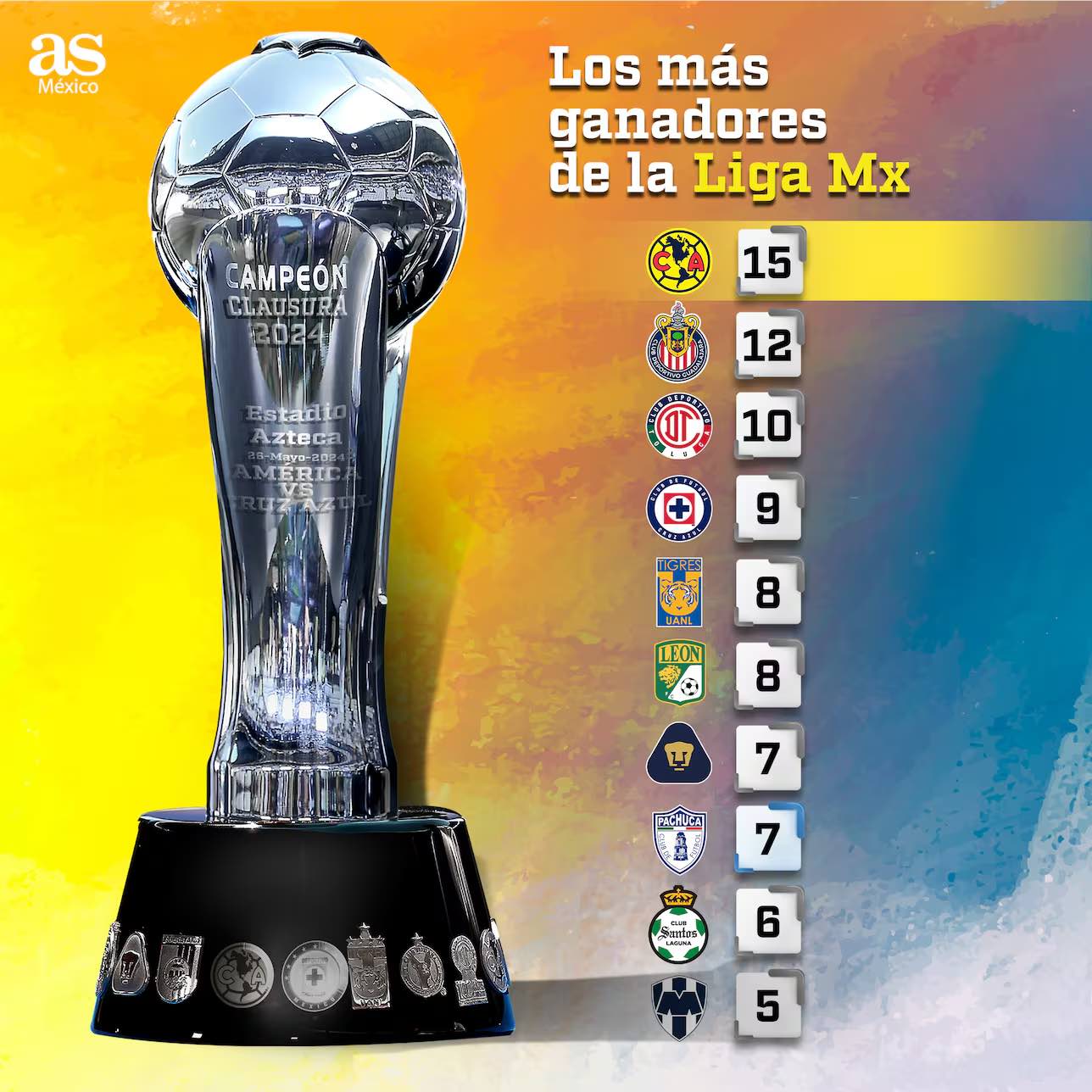 Los azulcrema extendieron aún más la diferencia en el palmarés histórico. Con 15 trofeos sus vitrinas, lideran la lista. Quienes les escoltan, las Chivas de Guadalajara, se quedaron con tres títulos de liga menos: 12. La brecha era mínima hasta hace siete meses. El Deportivo Toluca, que lleva 14 años sin coronarse, aún mantiene la tercera plaza, con 10 conquistas. Cruz Azul no pudo añadir la décima copa a su museo y se quedó con nueve. Completan el top 5 León y Tigres, empatados con ocho. En total, 24 clubes han conseguido al menos un campeonato de Liga MX desde que el desaparecido Asturias inaugurara el conteo, allá por 1944.Añadido a los 15 campeonatos de liga, ‘Las Águilas’ también presumen de seis Copas (récord), seis Campeón de Campeones, siete Copas de Campeones de la Concacaf (récord, también), dos Copas Interamericanas y una Copa de Gigantes de Concacaf. En total, la institución de Coapa ha conseguido 37 títulos a nivel profesional. El indiscutible máximo ganador del fútbol mexicano.