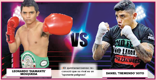 CANCÚN.-EL pugilista quintanarroense Daniel ‘Tremendo’ Soto en entrevista con Grupo Cantón destacó que entrena a marchas forzadas para enfrentar al campechano Leonardo ‘Diamante’ Mosqueda, el 25 de febrero en el ‘Polifórum’ de la Unidad Deportiva “Playa del Carmen”, en pelea de peso Superligero pactada a diez rounds, donde estarán en juego dos títulos: el Plata de la Federación Centroamericana de Boxeo (Fecarbox) y el Nacional de la Federación de las Comisiones de Box Profesional de la República Mexicana (Fecombox).