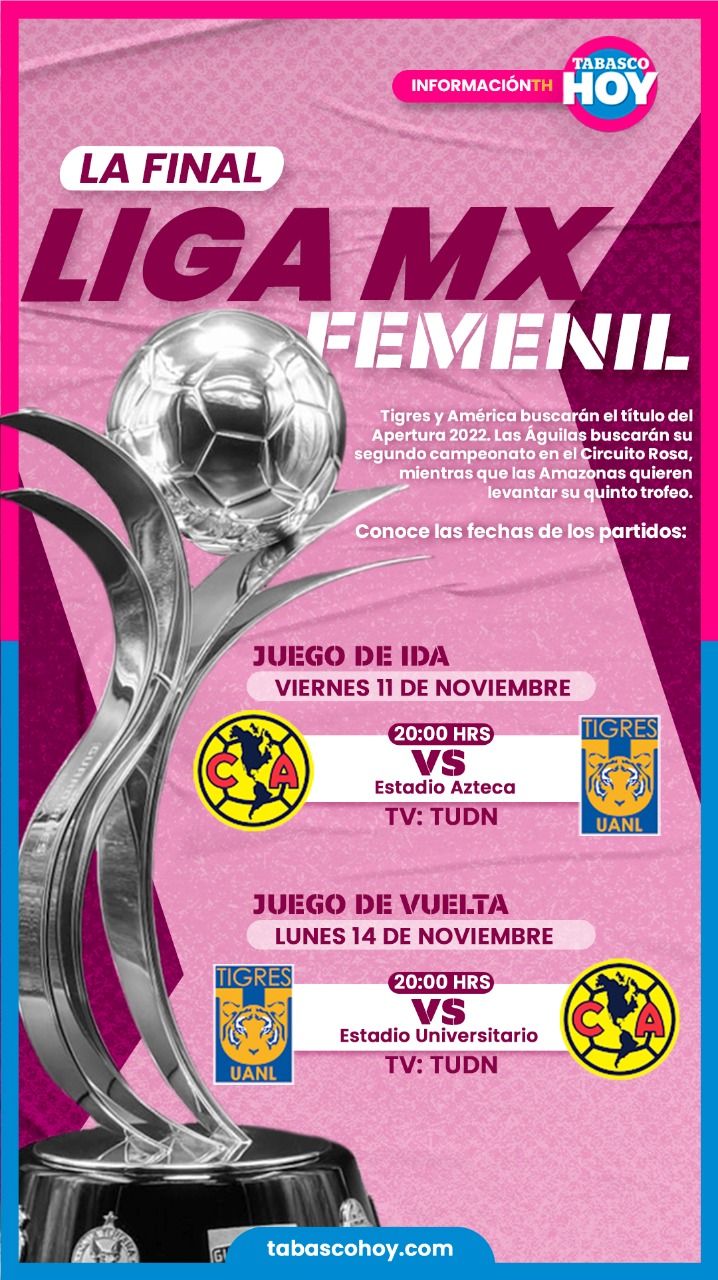 Ciudad de México.- Quedaron definidos los horarios de la Gran Final del Apertura 2022 de la Liga Mx Femenil, donde se medirán Tigres y América por el título de esta categoría, siendo la reedición de la Final del Apertura 2018.