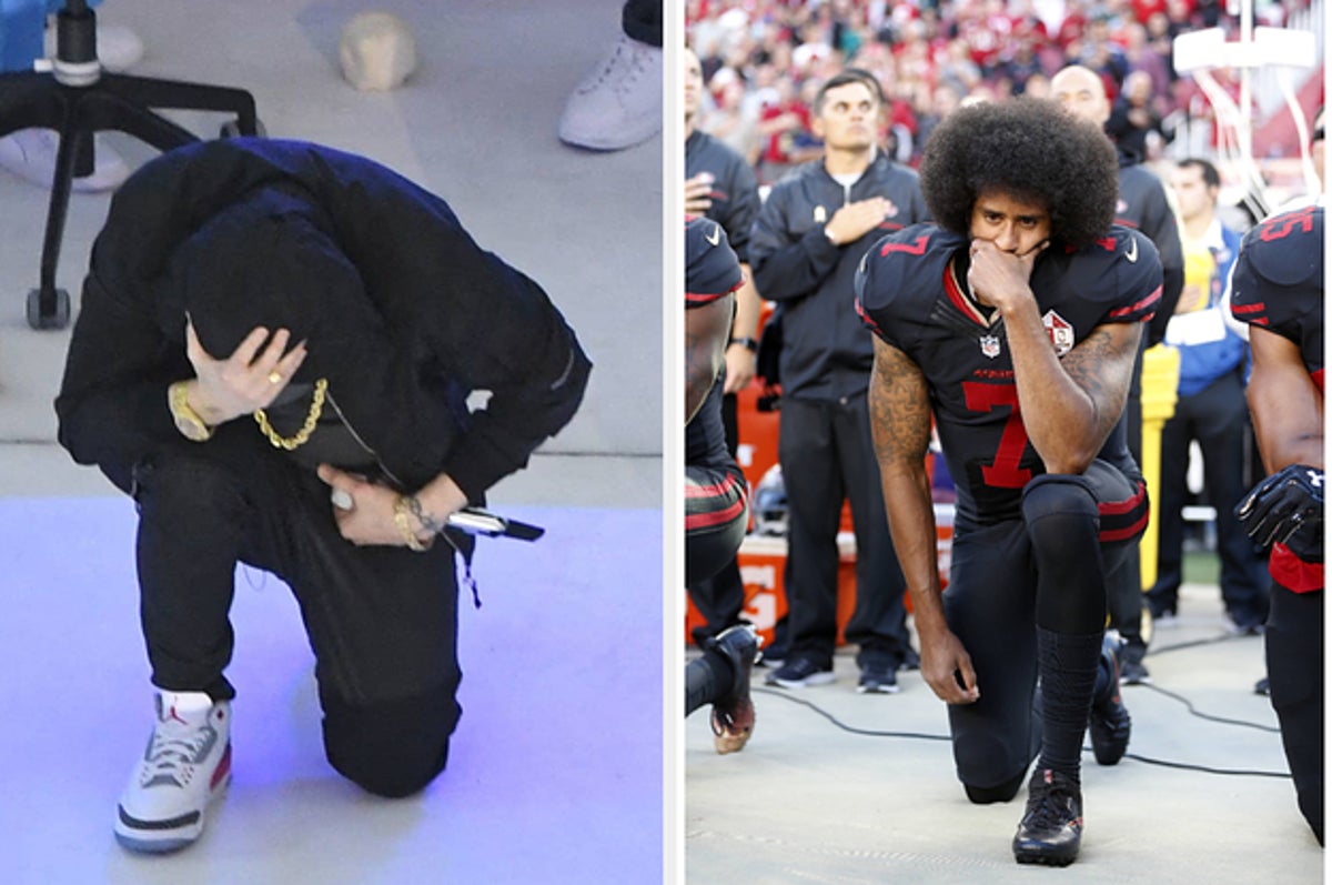 Pero el que no se quedó atrás fue Eminem, quien desafió a la NFL al arrodillarse en honor a Colin Kaepernick, quien fue obligado a retirarse como jugador hace un par de años tras empezar una campaña de protesta arrodillándose en cada partido tras los acontecimientos donde murió el afroamericano George Floyd.