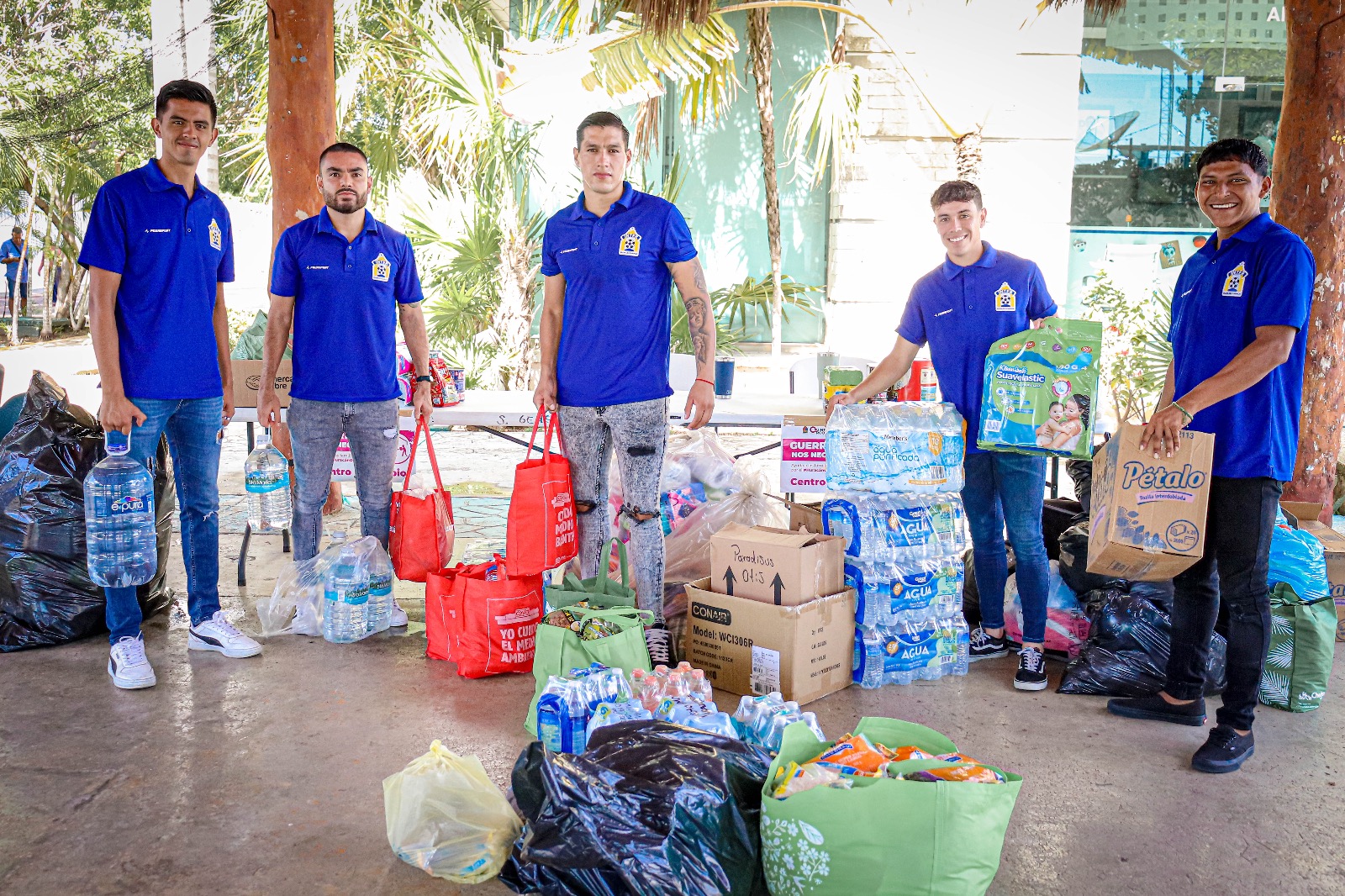Los jugadores Daniel Jiménez, Sergio Meza, Pablo Guzmán y Andrés Pérez junto con directivos fueron quienes hicieron la entrega al Centro de Acopio instalado en la palapa del DIF Solidaridad de paquetes de agua embotellada; bolsas de sopa de pasta, arroz, frijol; latas de atún; aceite vegetal comestible; galletas saladas; papel higiénico, entre otros.