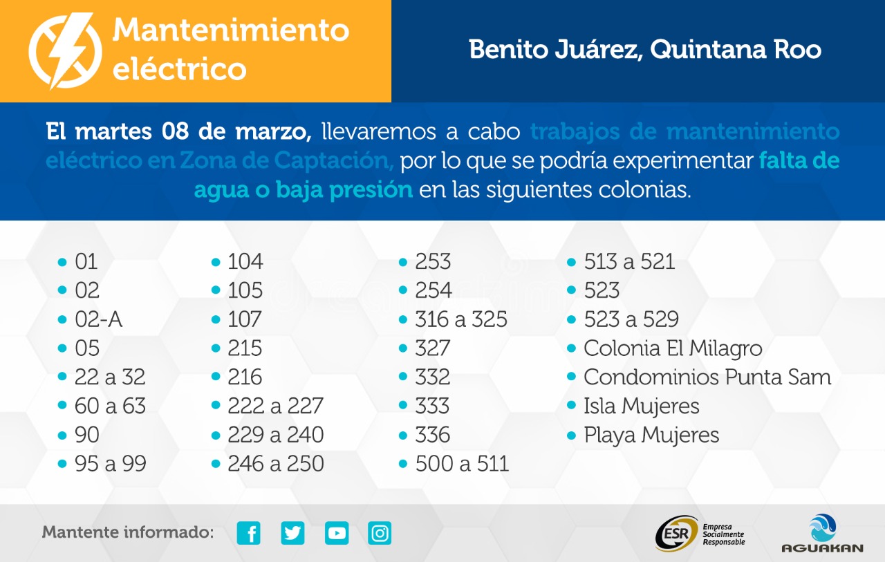 Cancún.- Con el objetivo de brindar un servicio eficiente en la distribución de la red de agua potable del municipio de Benito Juárez, el próximo martes 08 de marzo, Aguakan realizará trabajos de mantenimiento eléctrico, por lo que el suministro de agua potable podría verse afectado en algunas colonias de Cancún.