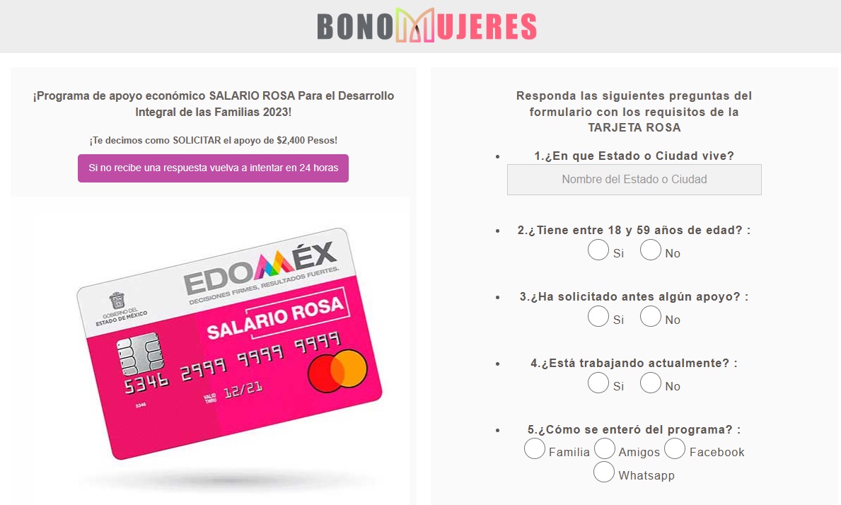 En ese portal, se le pide a incautos ciudadanos que ingresen datos personales, además de incluso pedir que se comparta con cinco personas. Aunque trae una imagen de las tarjetas de Salario Rosa del Estado de México, carece de cualquier sello oficial o liga hacia esa institución.
