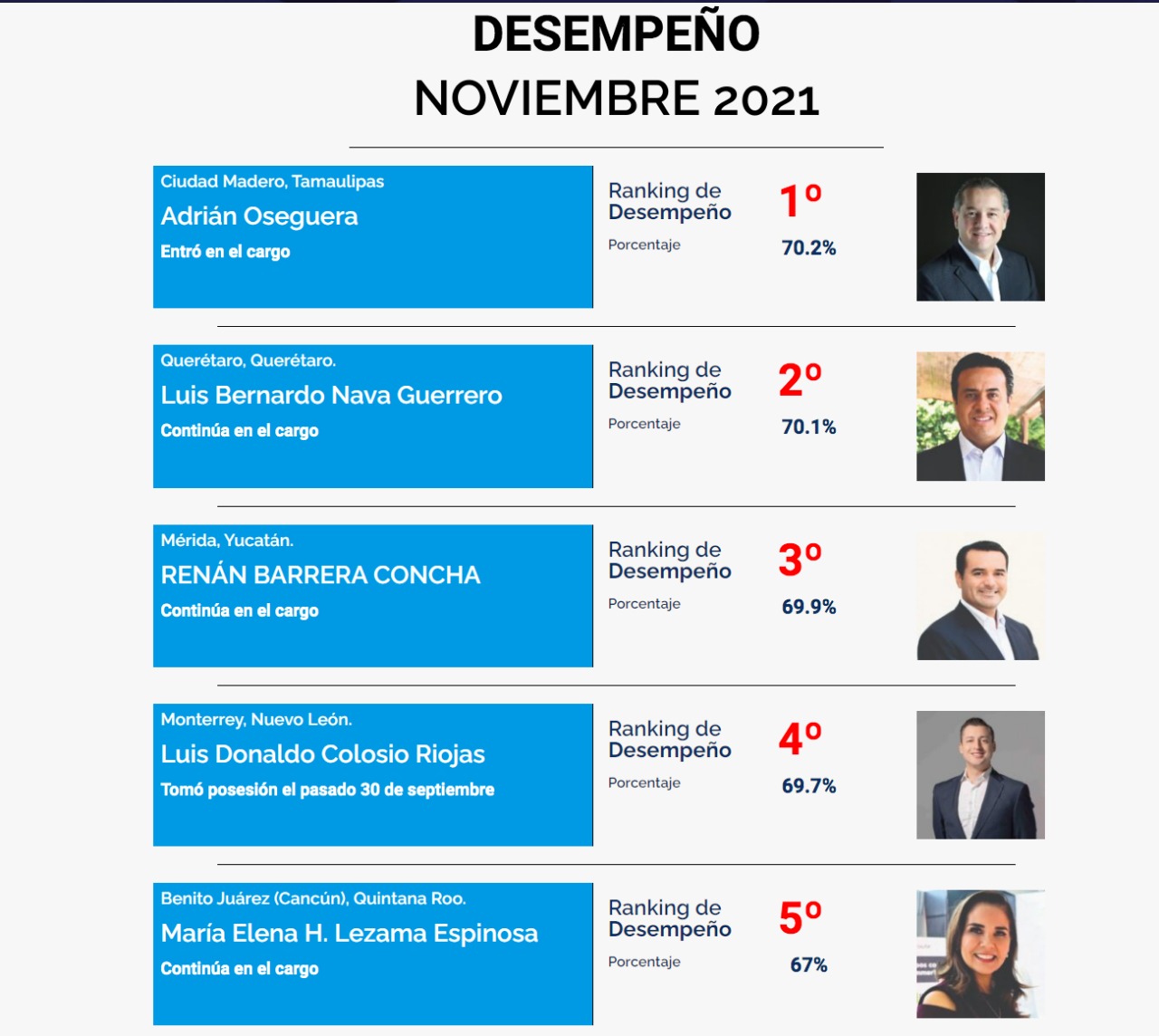 En este 11º ranking, el alcalde mejor evaluado es Adrián Oseguera, de Ciudad Madero, Tamaulipas, con 70.2% de aprobación; en segundo lugar, con 70.1%, Luis Bernardo Nava Guerrero, de Querétaro, Querétaro; en tercer lugar, con 69.9%, Renán Barrera, de Mérida, Yucatán; en cuarto lugar, Luis Donaldo Colosio Riojas, de Monterrey, Nuevo León, con 69.7%; y en quinto lugar, con 67% de aprobación, Mara Lezama, de Benito Juárez, Quintana Roo.