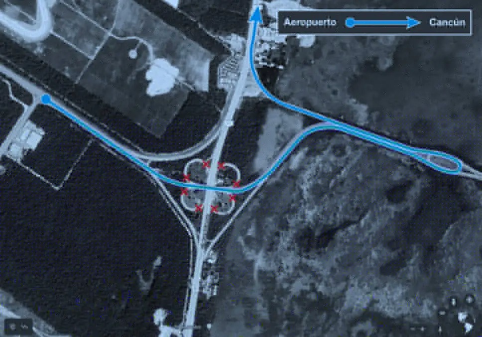1.- Para vehículos saliendo del aeropuerto hacia la ciudad de Cancun circular tomando el puente actual, ir en dirección a la Zona Hotelera y en glorieta de FONATUR retornar para tomar la desviación a la gasolinera e incorporarse detrás de ella en el boulevard Colosio. (Se tratara que esta última vialidad atrás de la gasolinera sea de 2 carriles).