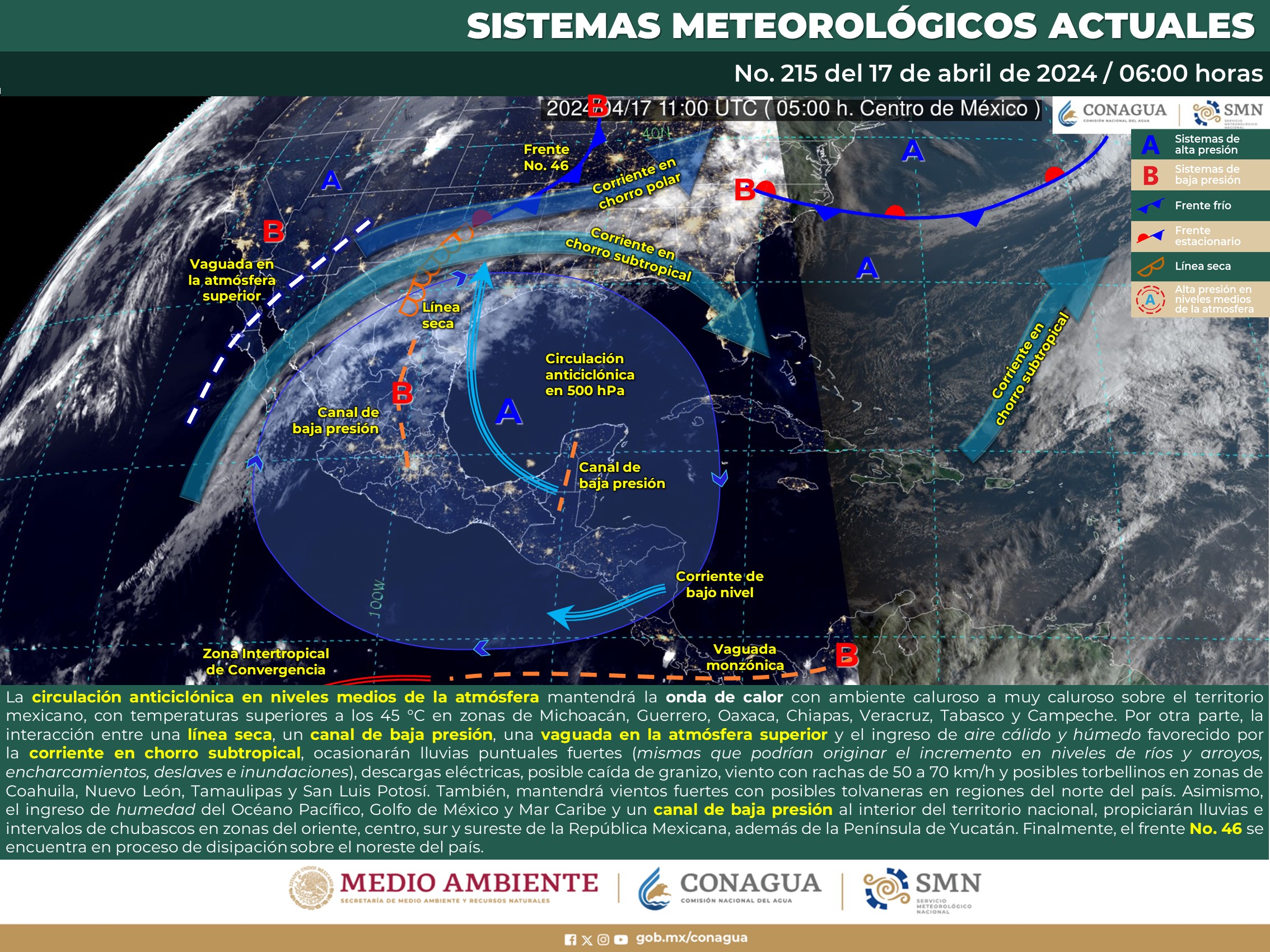 Para este día, la circulación anticiclónica en niveles medios de la atmósfera mantendrá la onda de calor con ambiente caluroso a muy caluroso sobre el territorio mexicano, con temperaturas que podrían superar los 45 °C en zonas de Michoacán, Guerrero, Oaxaca, Chiapas, Veracruz, Tabasco y Campeche. Por otra parte, la interacción entre una línea seca, un canal de baja presión, una vaguada en la atmósfera superior y el ingreso de aire cálido y húmedo favorecido por la corriente en chorro subtropical, ocasionarán lluvias puntuales fuertes (mismas que podrían originar el incremento en niveles de ríos y arroyos, encharcamientos, deslaves e inundaciones), descargas eléctricas, posible caída de granizo, viento con rachas de 50 a 70 km/h y posibles torbellinos en Coahuila, Nuevo León, Tamaulipas y San Luis Potosí. También, mantendrá vientos fuertes con posibles tolvaneras en regiones del norte del país. Asimismo, el ingreso de humedad del Océano Pacífico, Golfo de México y Mar Caribe y un canal de baja presión al interior del territorio nacional, propiciarán lluvias e intervalos de chubascos en zonas del oriente, centro, sur y sureste de la República Mexicana, además de la Península de Yucatán. Finalmente, el frente No. 46 se encuentra en proceso de disipación sobre el noreste del país.