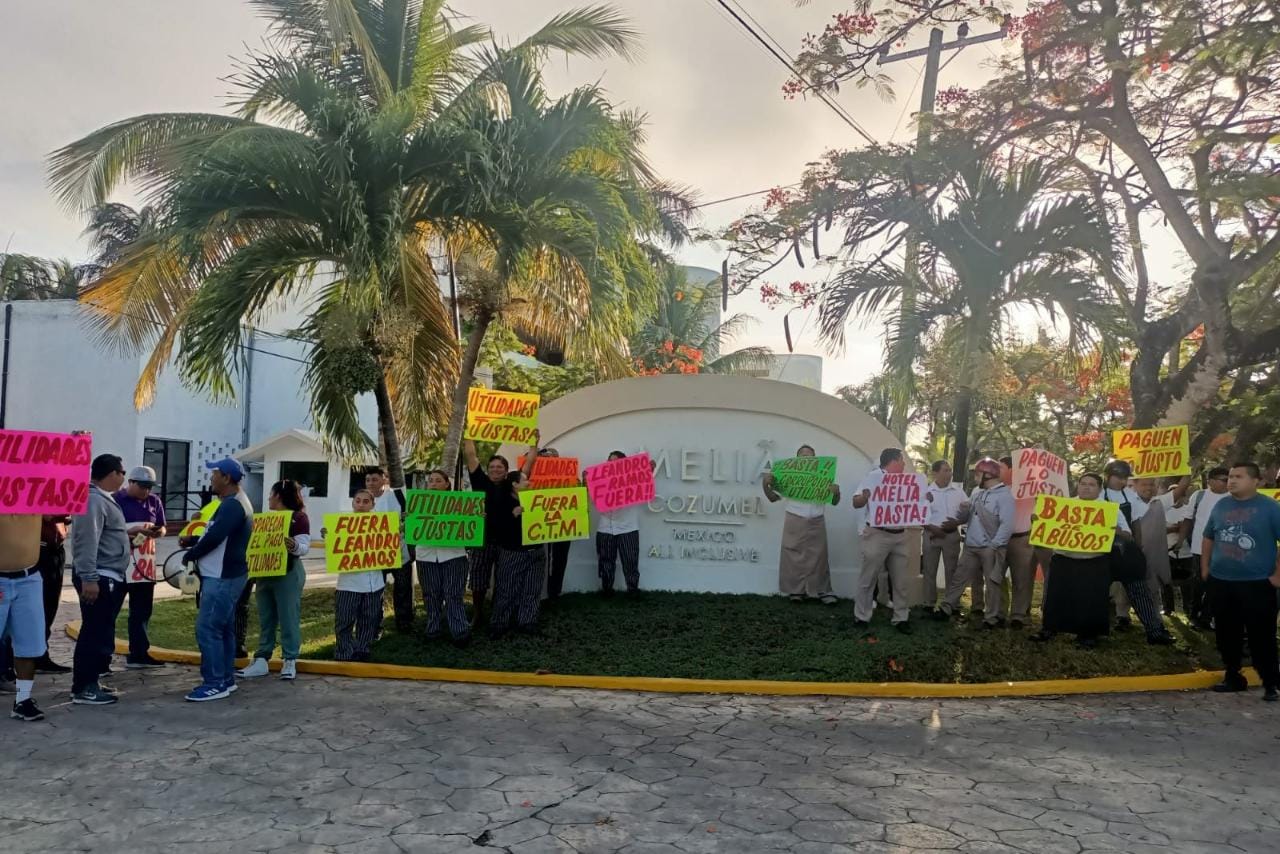 COZUMEL.- Unos 50 trabajadores se manifestaron a las afueras del hotel Meliá, para exigir el pago justo de sus utilidades, así como el cambio de sindicato, ya que argumentan que no se sienten respaldados por la CTM.