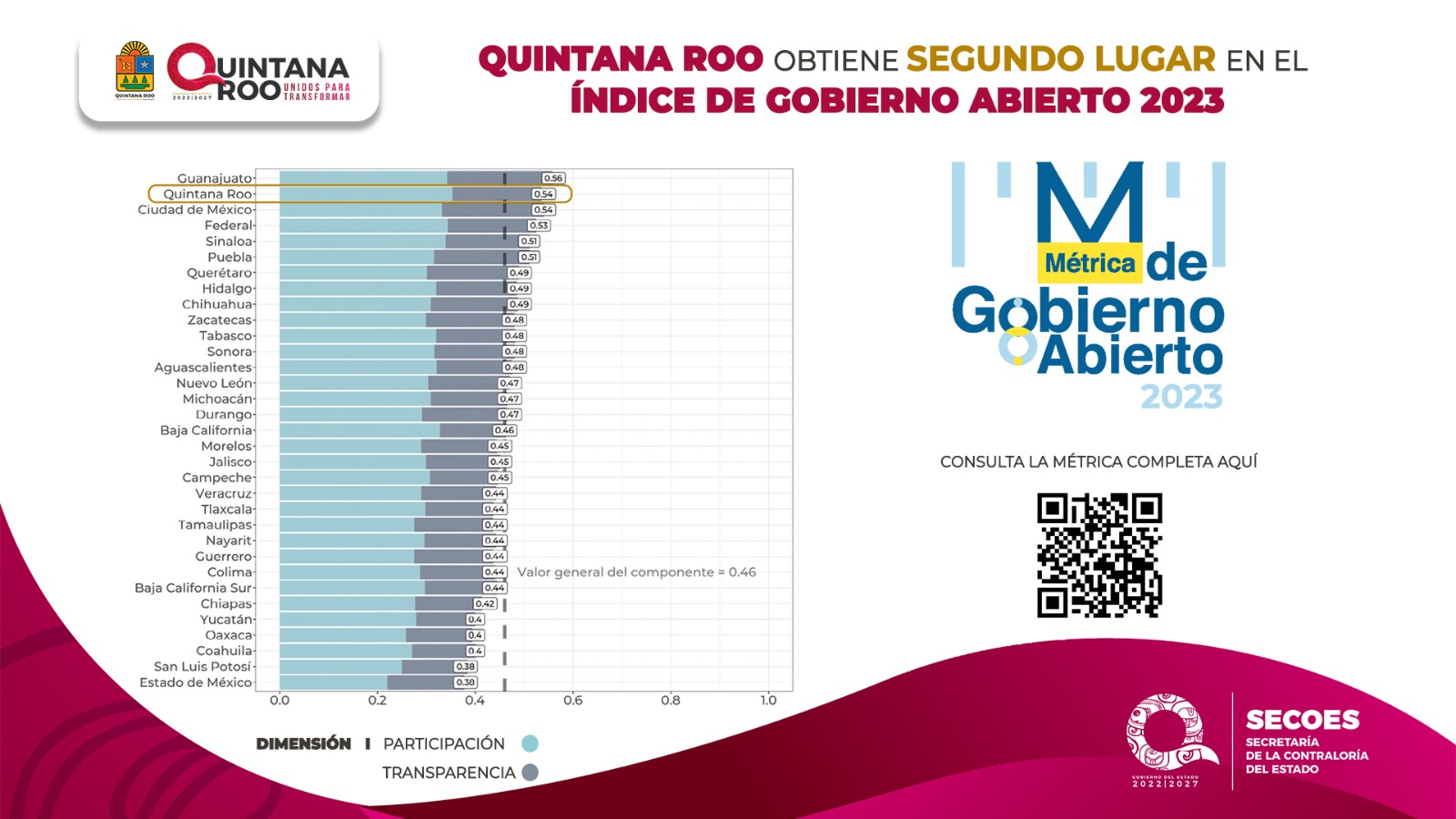 Explicó que Quintana Roo pasó del lugar número 9 que ocupó en 2021, a ser el segundo lugar con 0.54, en el Índice de Gobierno Abierto 2023 por entidad federativa presentada por el Instituto Nacional de Transparencia, Acceso a la Información y Protección de Datos Personales (INAI) y el Colegio de México.