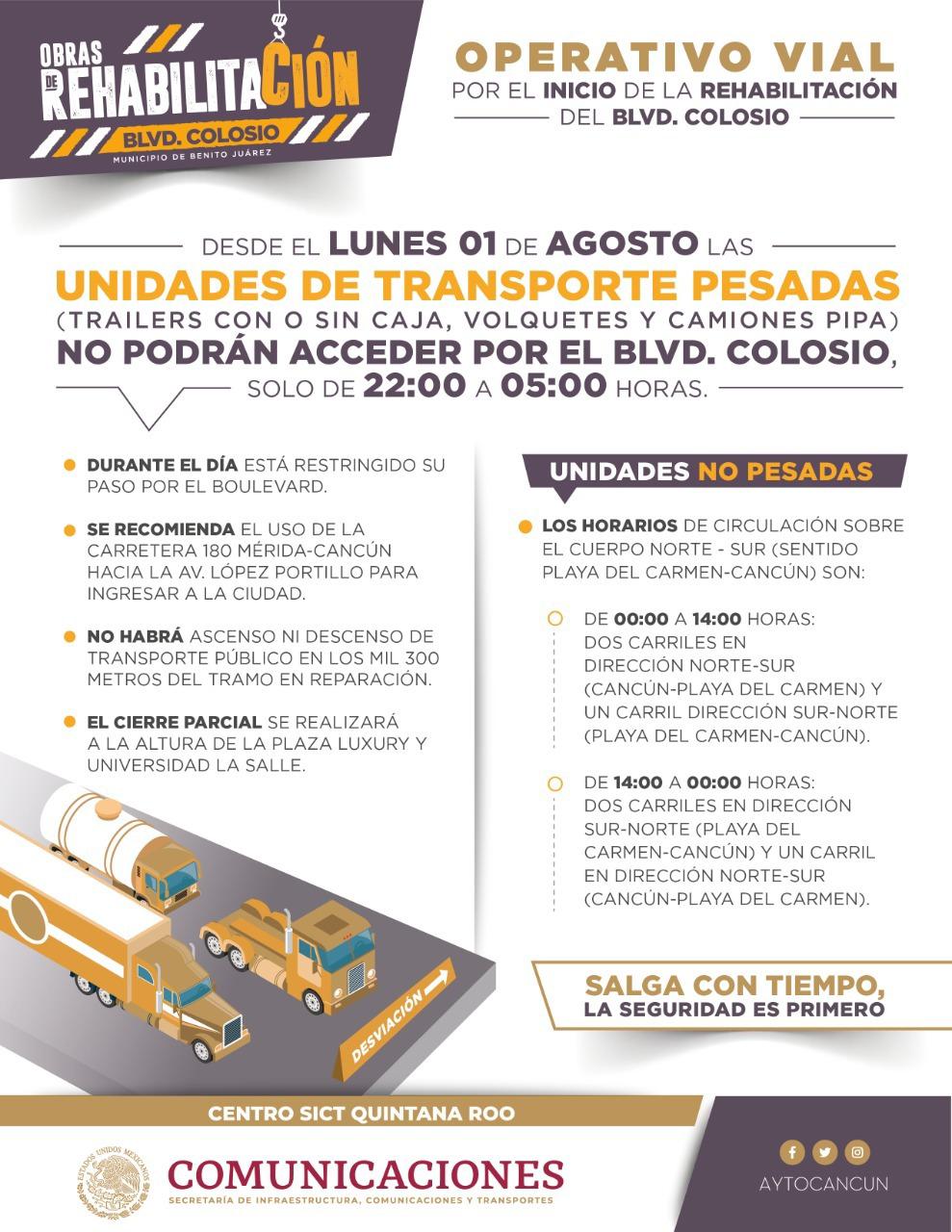 Para garantizar el orden del tránsito y la seguridad de los benitojuarenses, quedará restringida la circulación matutina por dicho boulevard para unidades de mayor volumen como trailers con o sin caja, volquetes y camiones pipa, únicamente de 22:00 a 05:00 horas y de preferencia ocupen la carretera 180 Mérida-Cancún hacia la Avenida José López Portillo.