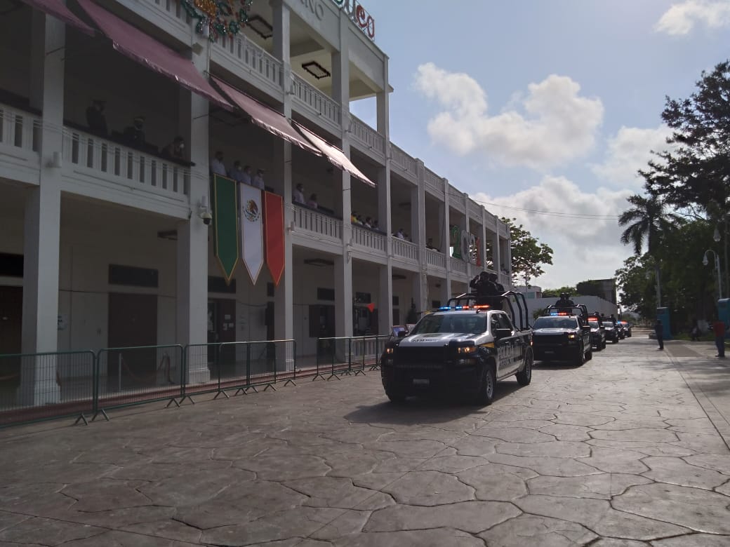 CHETUMAL.- Los alrededores de la explanada de la Bandera fueron cerrados con vallas metálicas para evitar el acceso a la ciudadanía que acudió al tradicional desfile conmemorativo a la Independencia de México, donde únicamente hubo participación de elementos de las corporaciones policíacas, altos mandos navales y militares, así como autoridades estatales que iban a bordo de unidades motrices.