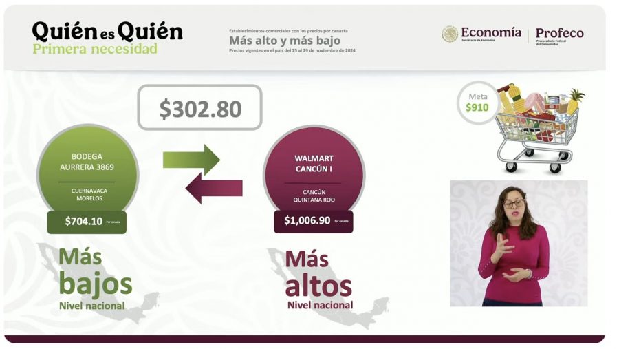 Durante la mañanera de este lunes se informó que se realizó un monitoreo del precio de la canasta básica del 25 al 29 de noviembre, el cual contiene 24 productos, por lo que comenzaron a comparar los precios, y se dio a conocer que el más bajo se encontró en la Bodega Aurrera de Cuernavaca, Morelos, a $704.10, mientras que la más cara fue en un Walmart de Cancún, Quintana Roo, a $1,006.90.