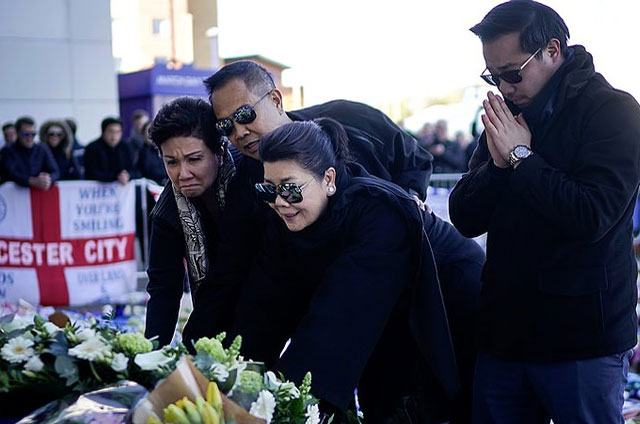 La viuda de Vichai Srivaddhanaprabha y su hijo Aiyawatt, vicepresidente del club, depositaron una corona de flores delante del King Power Stadium, donde se han acumulado ramos de flores, bufandas y camisetas para honrar la memoria del multimillonario tailandés y las otras cuatro personas que viajaban en el helicóptero, también fallecidas.