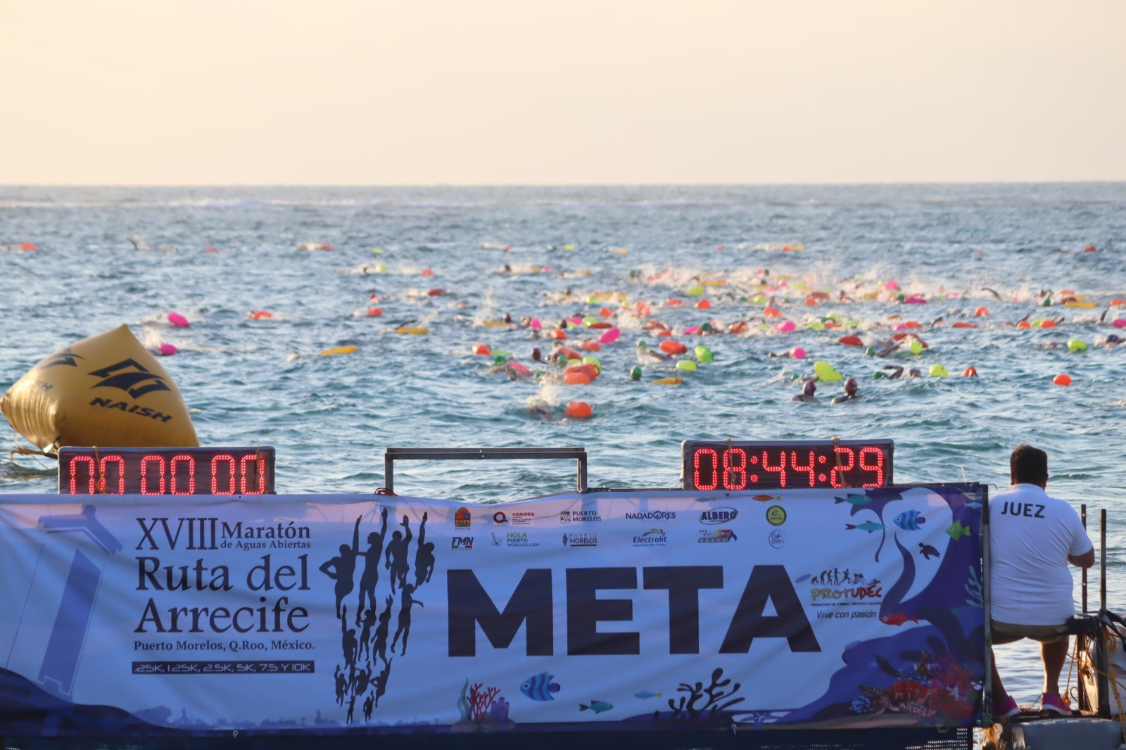 Puerto Morelos.- Todo un éxito fue el XVIII Maratón de Aguas Abiertas ‘Ruta del Arrecife’ que se realizó con 830 participantes nacionales y extranjeros en un circuito de 1.25 kilómetros ubicado frente a la ‘Ventana al Mar’ en Puerto Morelos.