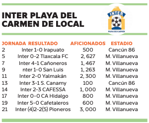 CANCÚN. – Con un promedio de 1, 095 personas por partido, el Inter Playa del Carmen fue el club de Quintana Roo con el mayor número de aficionados de local durante la Temporada 2019-2020 de la Serie A de la Liga Premier, que recientemente se dio por finalizada por el Covid-19.