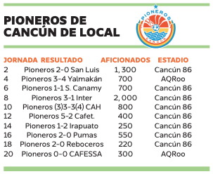 Por su parte, Pioneros de Cancún tuvo un promedio de 802 personas por partido de local y su mejor entrada fue en la fecha ocho también en el clásico quintanarroense ante el Inter Playa del Carmen, con 2 mil aficionados en el estadio “Cancún 86”.