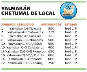 Finalmente, Yalmakán FC, que cumplió con su segunda campaña en la capital del estado, registró un promedio de 515 personas por partido en casa y su mejor entrada fue ante Pioneros de Cancún, con 650 aficionados, esto en la jornada 17 en el estadio “José López Portillo”.
