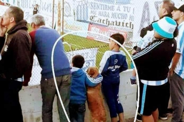 En la fotografía, se puede percibir como un par de niños están sobre el alambrado viendo el duelo entre Racing de Córdoba y Estudiantes de Río Cuarto, pero en medio está su mascota y el más pequeño lo tiene abrazado.