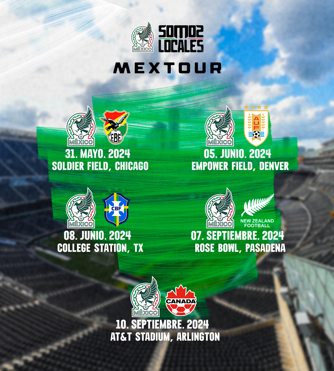 El tour del Tri por Estados Unidos comenzará el viernes 31 de mayo contra Bolivia en el estadio Soldier Field de Chicago; el miércoles 5 de junio se medirá con Uruguay en el estadio Empower Field en Denver y el sábado 8 de junio lo hará ante Brasil, en el estadio Kyle Field de Texas.