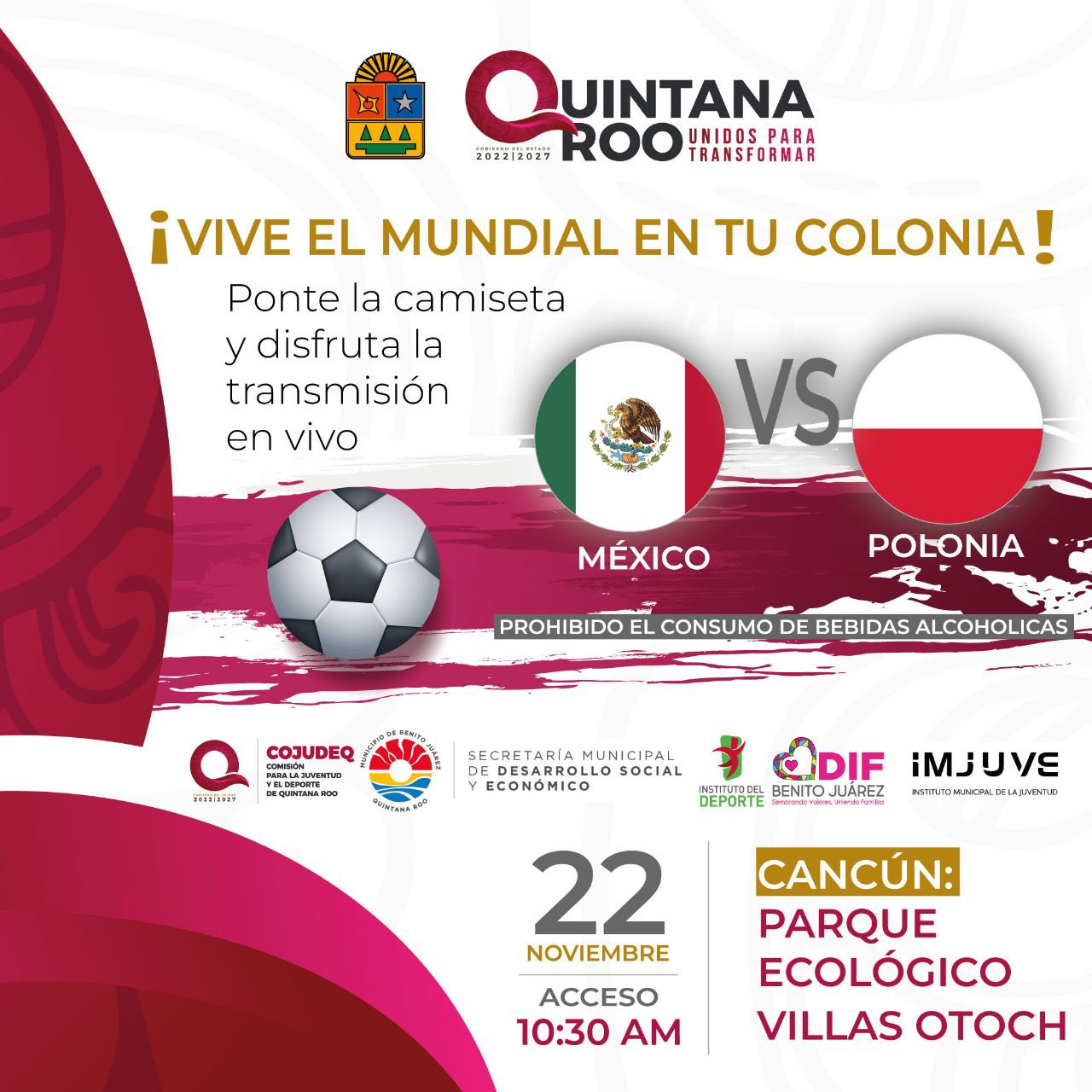 Así lo informó Eric Arcila Arjona, presidente de la Cojudeq al detallar que con ¡Vive el Mundial en tu colonia! los días martes 22, sábado 26 y miércoles 30 de noviembre se colocarán pantallas en el los parques Hábitat III en Chetumal y el Ecológico Villas Otoch en Cancún para que todas y todos se pongan la camiseta y acudan a apoyar al equipo nacional.