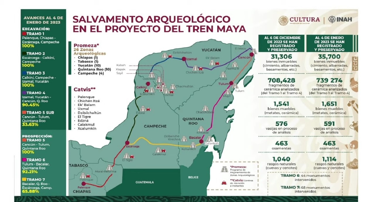 En la etapa de excavación, en el Tramo 4 que va de Izamal a Cancún, hay un avance del 90.45%; en el tramo 5 Sur, Playa del Carmen-Tulum, el avance es del 33.63%. En la etapa de prospección, en el tramo 5 el avance es del 100%; en el tramo 6 es del 92.21% y en el tramo 7, dicho avance es de 65.88%.
