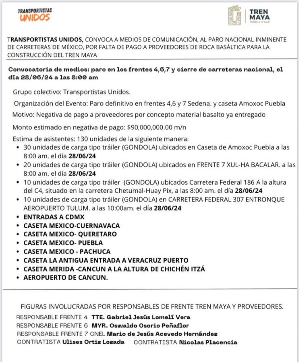 “Convoca al paro nacional inminente de carreteras de México por falta de pago a proveedores de roca basáltica para el Tren Maya”, señala la convocatoria lanzada hace unos minutos.